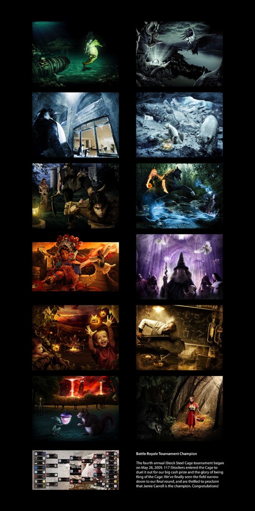 Once upon a time, iStockphoto hosted a Photoshop competition so grueling that it deserves it’s own page for an acknowledgement. Although there were five battle royale seasons, this focuses on the iStock Battle Royale IV competition. I entered the battle royale III tournament and advanced to the second round. I won the battle royale IV competition, and was a guest judge in the battle royale V competition.